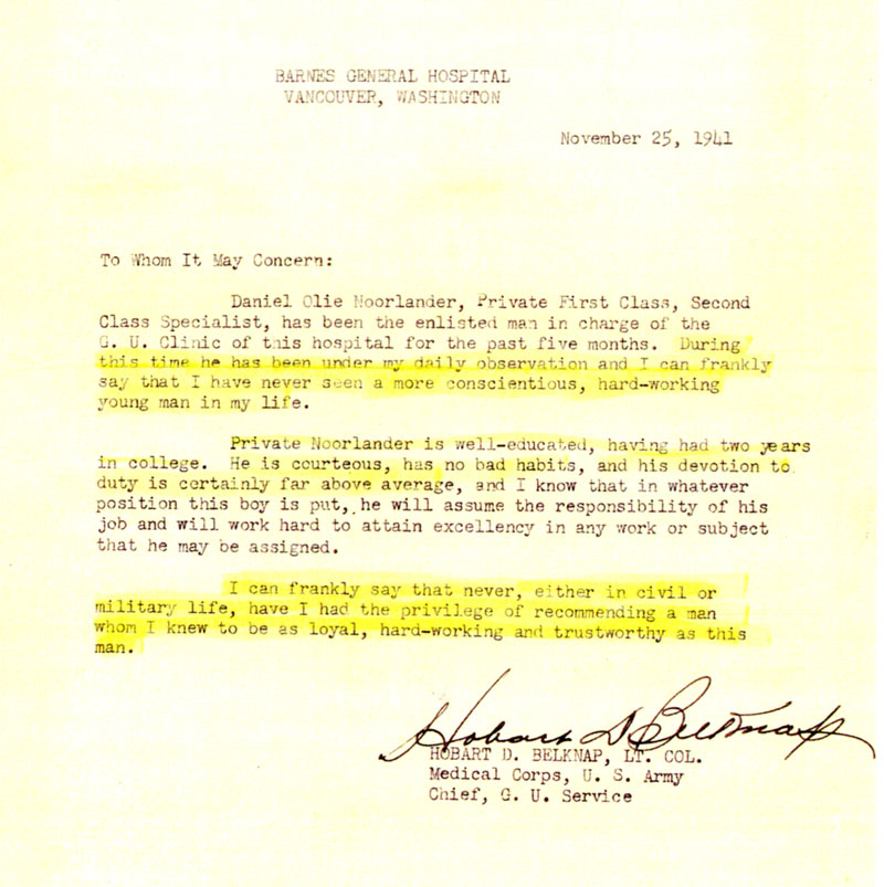 “Colonel Belknap said that he wanted me to go with him to the European theater of operations as a member of his MASH team. I told him that I felt my destiny was with the infantry, and that I would appreciate any help he could give me to get there. ‘OK,’ he said, ‘but if you want to go into the infantry, apply for Infantry School as an officer candidate,’ which I did. After graduation, I had to wait before I was eligible for a commission because an officer had to be 21. The Colonel went to bat for me again when he made me a corporal. I waited in the Washington National Guard until I turned 21.