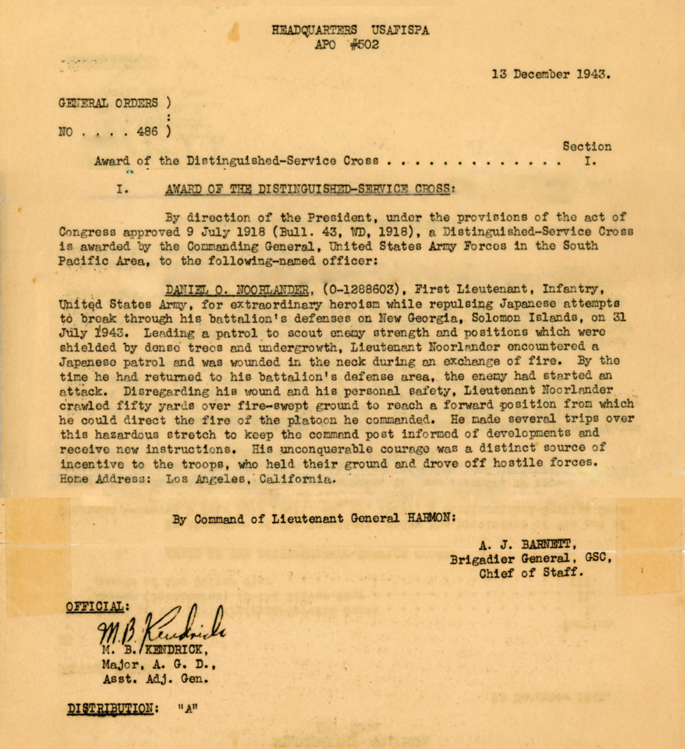 DANIEL O. NOORLANDER, (0-1288603), First Lieutenant, Infantry, United States Army, for extraordinary heroism while repulsing Japanese attempts to break through his battalion’s defenses on New Georgia, Solomon Islands, on 31 July 1943.