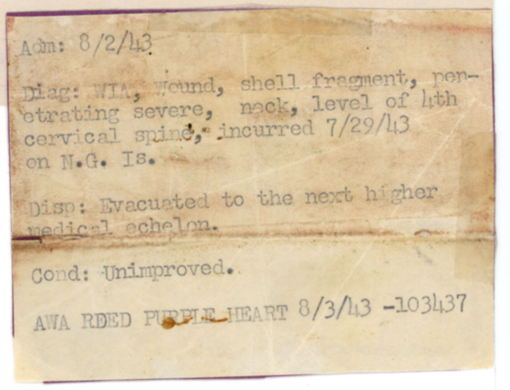 Diag: WIA [Wounded In Action], Wound, shell fragment, penetrating severe, neck, level of 4th cervical spine, incurred 7/29/43 on N.G. [New Georgia] Island.