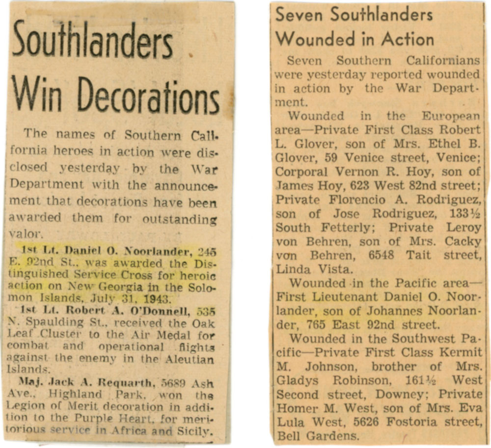 Lt. Noorlander was wounded in this action (July 31, 1943). He received the Purple Heart, as well as the Distinguished-Service Cross, “for extraordinary heroism while repulsing Japanese attempts to break through his battalion’s defenses on New Georgia, Solomon Islands.” Read the details in the army document to the right.