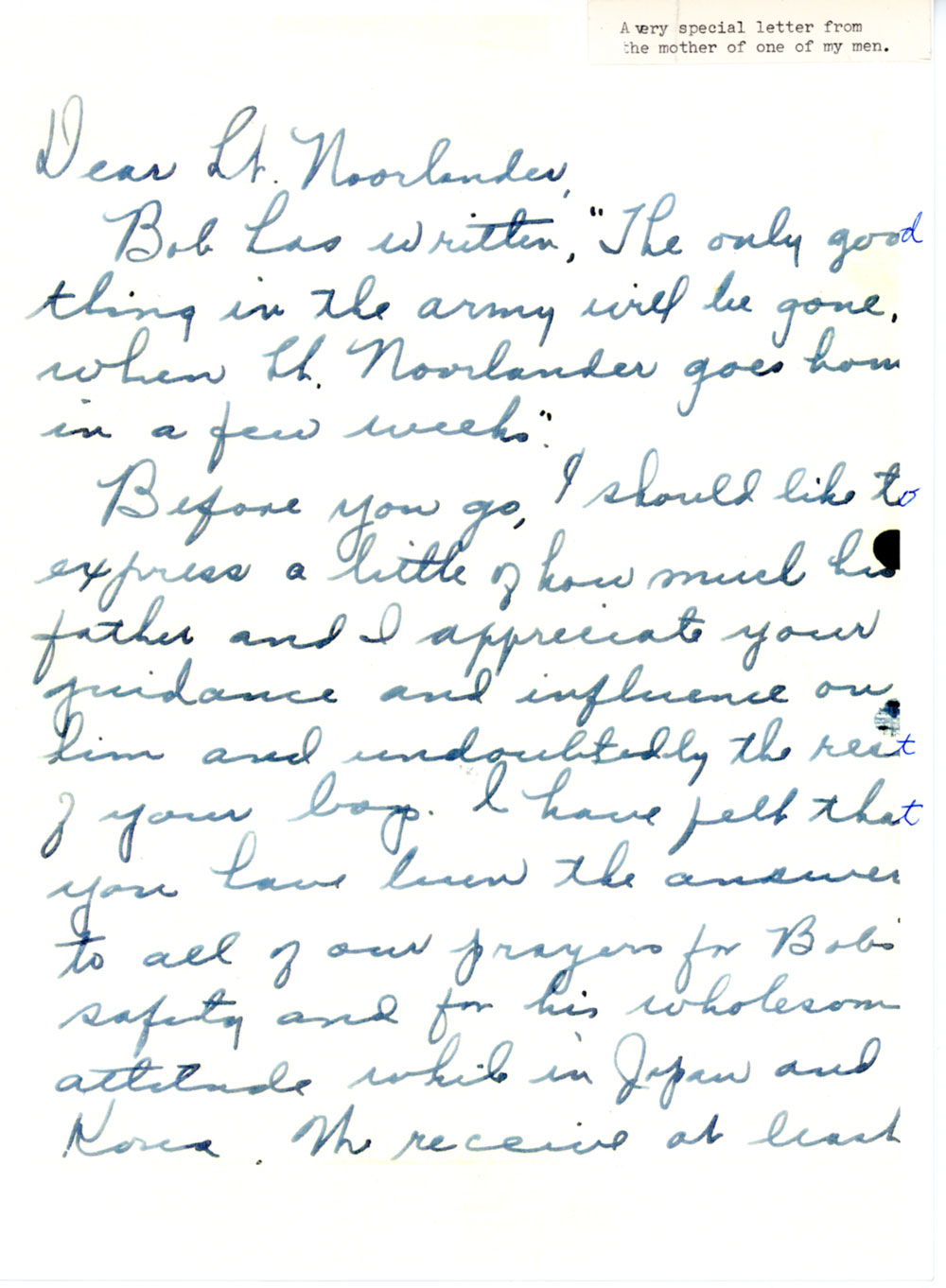 “In April 2002, I received a phone call from a man who told me that his name was Lt. Colonel Bob Lytle, and that he had served with Dan in Korea. I told him that Dan has passed away and that I was His wife. He then told me that he was talking with his friend Major Irving Taylor, reminiscing about their time in Korea. They wondered what had happened to Lt. Noorlander.